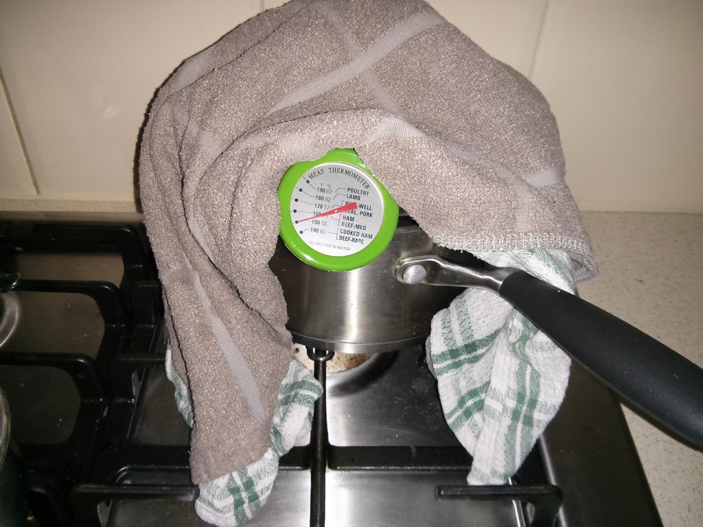 29/5/15 9:00AM – Mixed half a teaspoon of gelatin into 100mL of 70C water and stirred until completely dissolved. Dropped the lot into the fermentation vessel. The FV was at 14.5C. I’ve turned on the refrigerator and will cold crash until next Tuesday (2/6/15) and will bottle then. I need to work out the bulk priming rate before then.
